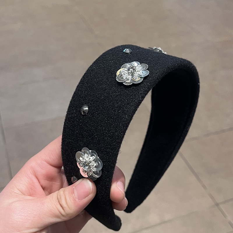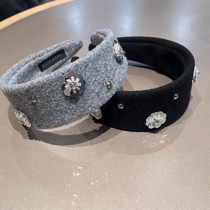 幅広のカチューシャに立体的な花型メタルモチーフとスタッズを絶妙な配置で装飾しました。