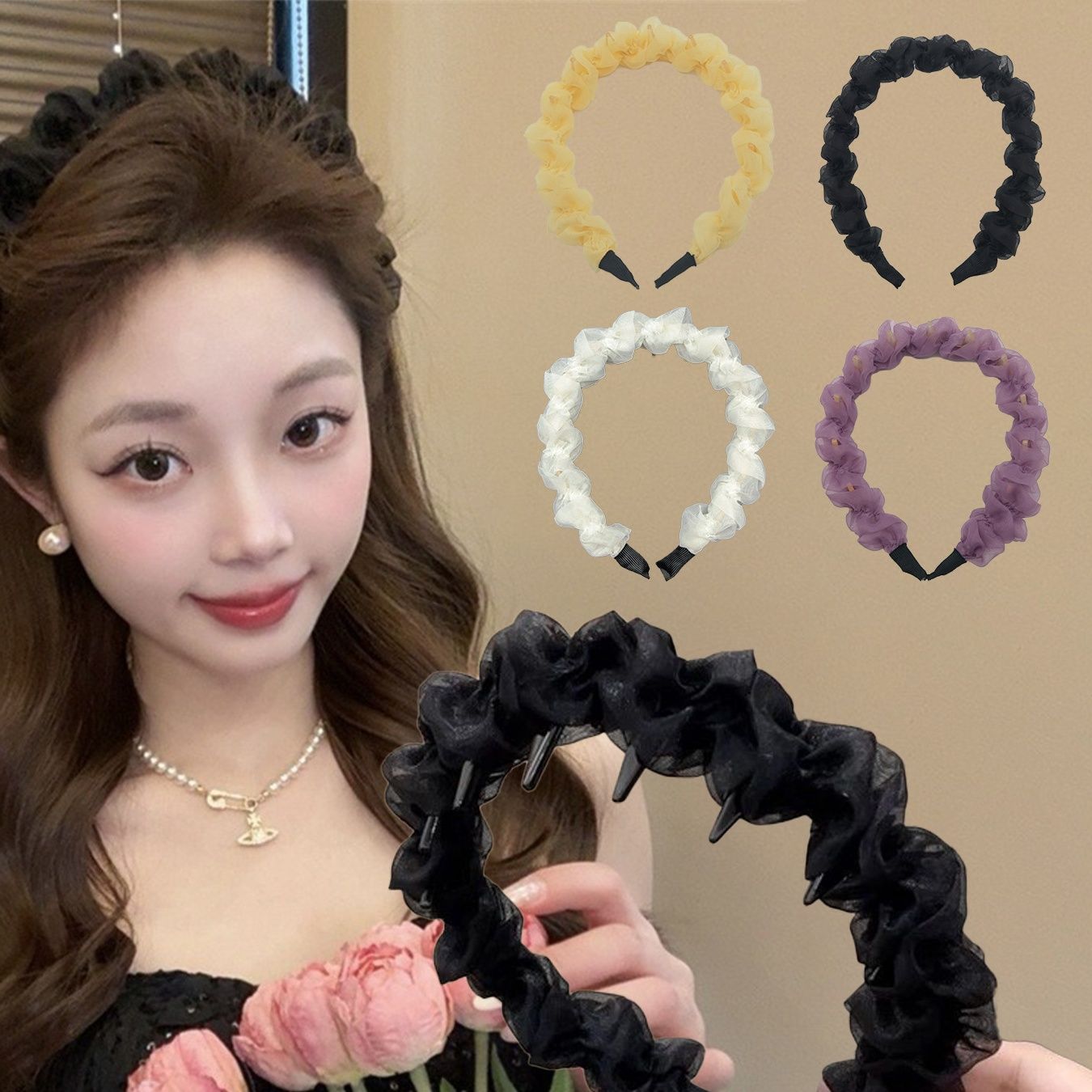柔らかな素材感が女性らしさを引き立て、どんな髪型にも合わせやすい万能アイテムです。