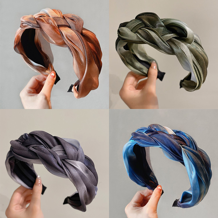 光沢のある上質なサテン生地を使用した、立体的な編み込みデザインが特徴のカチューシャです。