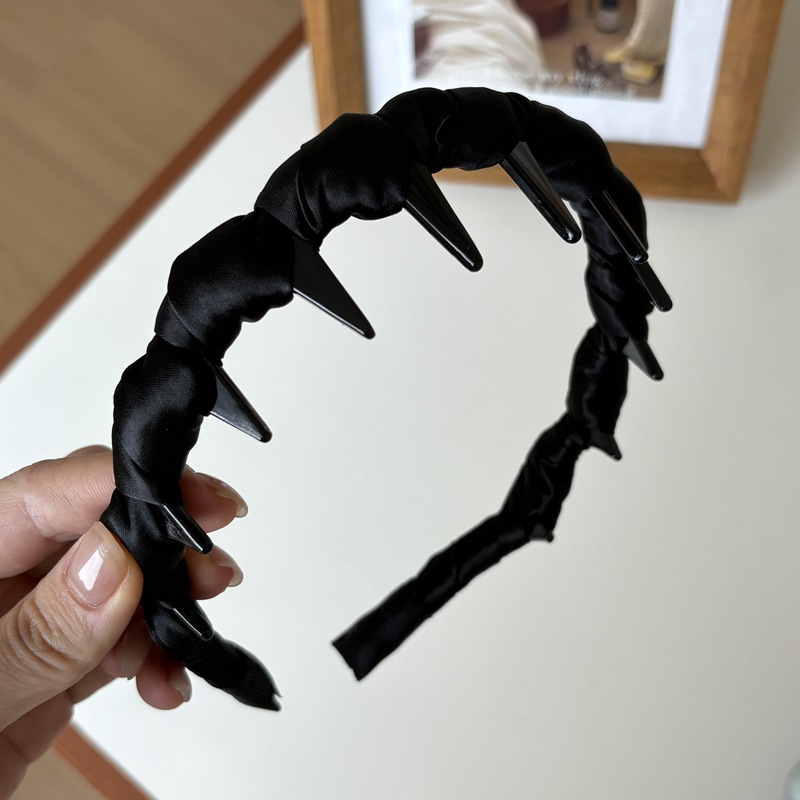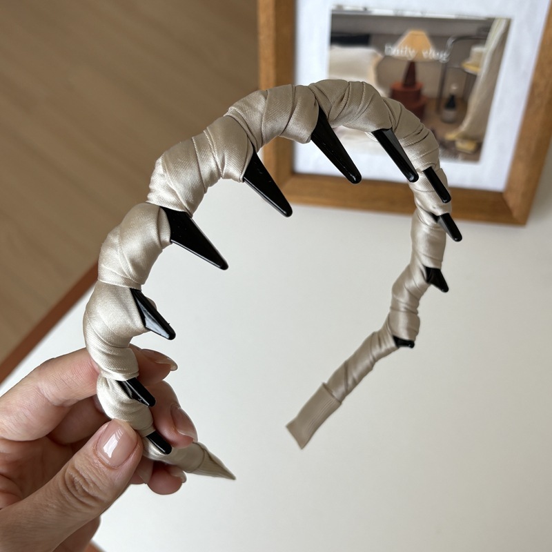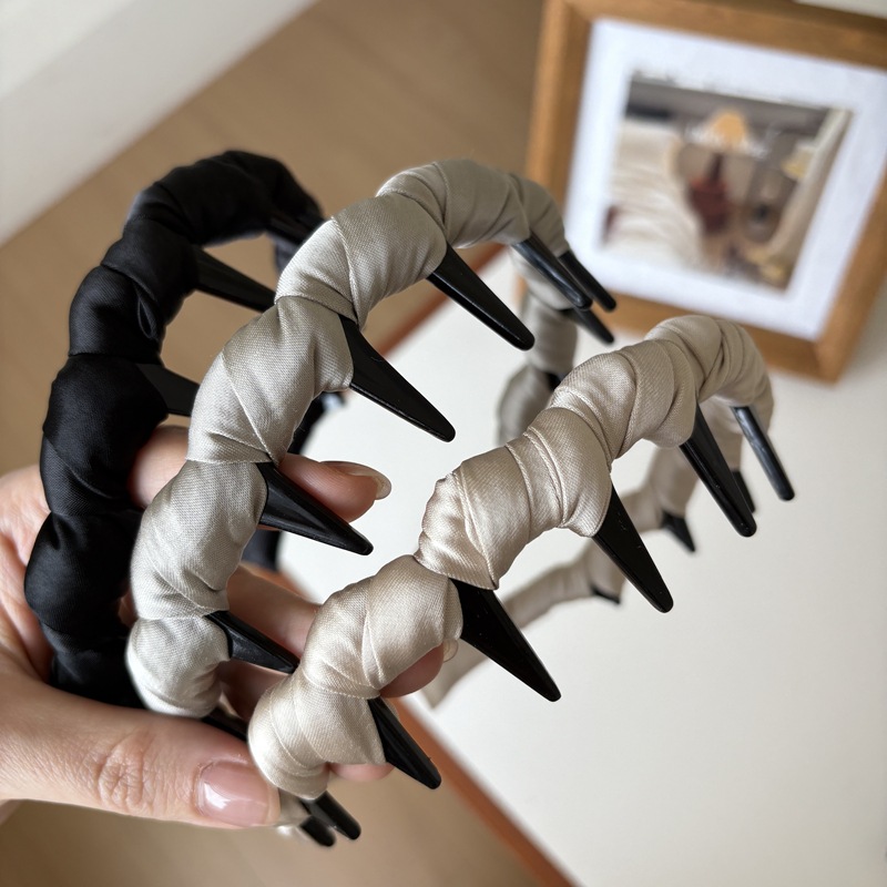 立体的な編み込みが華やかさを演出し、シンプルながらも存在感のあるカチューシャに仕上がっています。