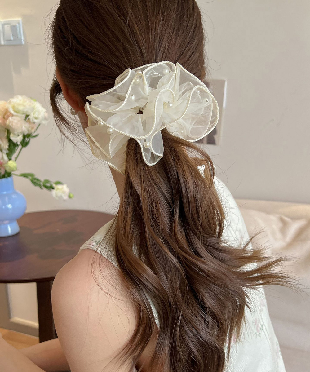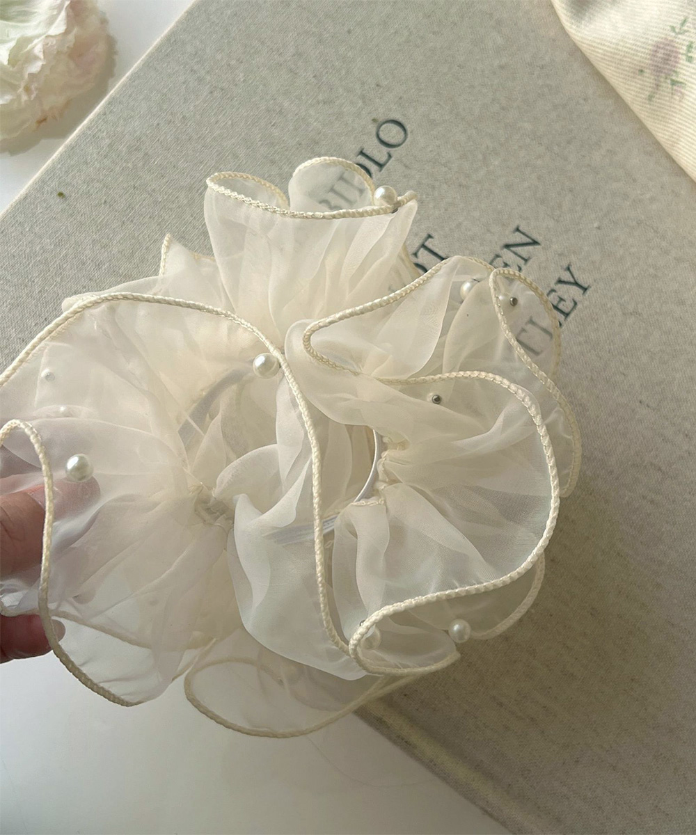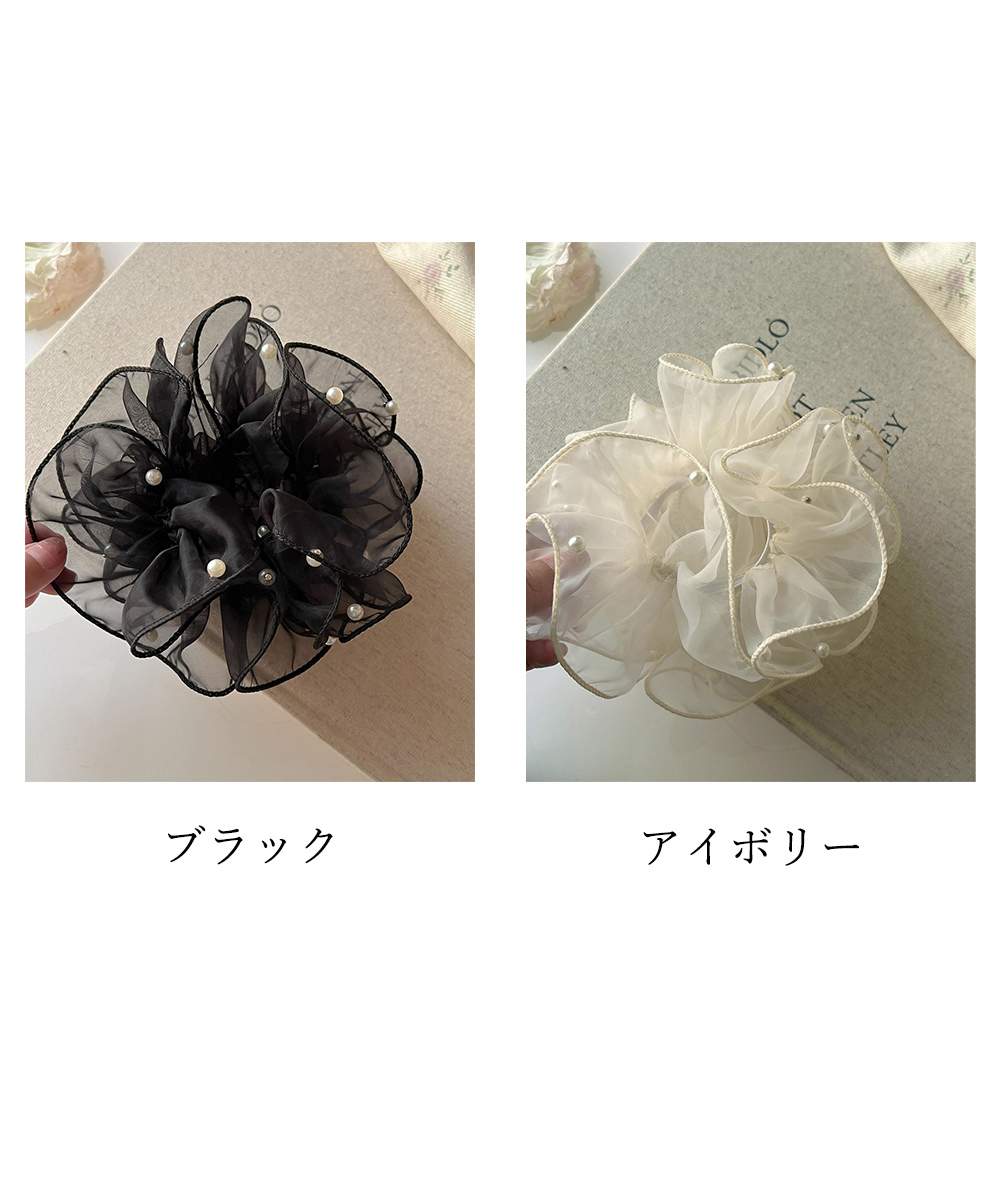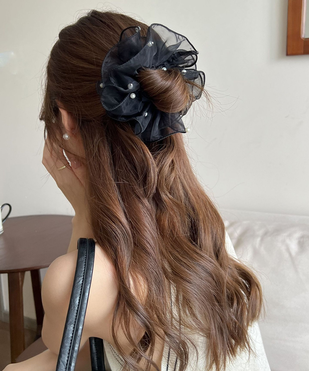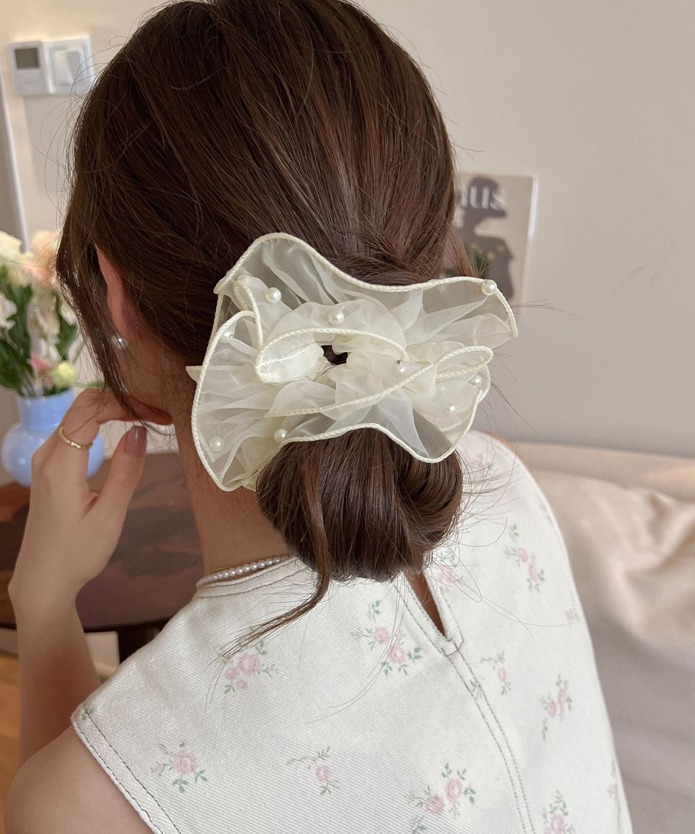透け感のあるオーガンジー素材を使用したシュシュは、上品なパールが散りばめられた大人向けのヘアアクセサリーです。